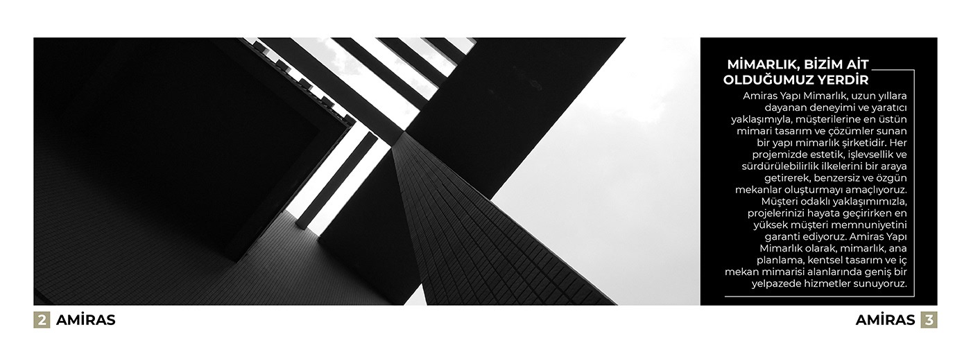 Amiras Yapı olarak, "Mimarlık, Bizim Ait Olduğumuz Yerdir" felsefesiyle çalışıyoruz. Bu felsefeyi sadece projelerimizde değil, size kendimizi tanıttığımız her materyalde yansıtmak bizim için birincil önceliktir.